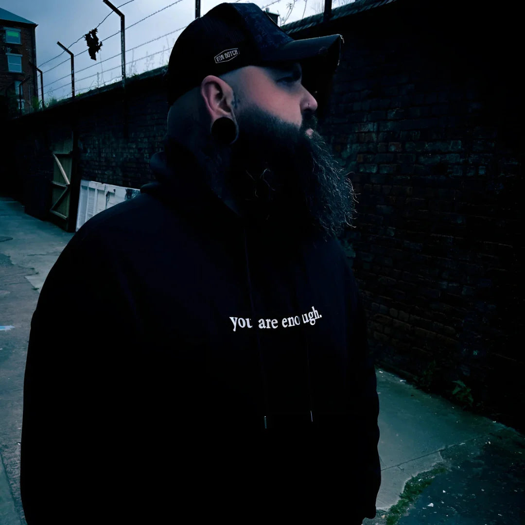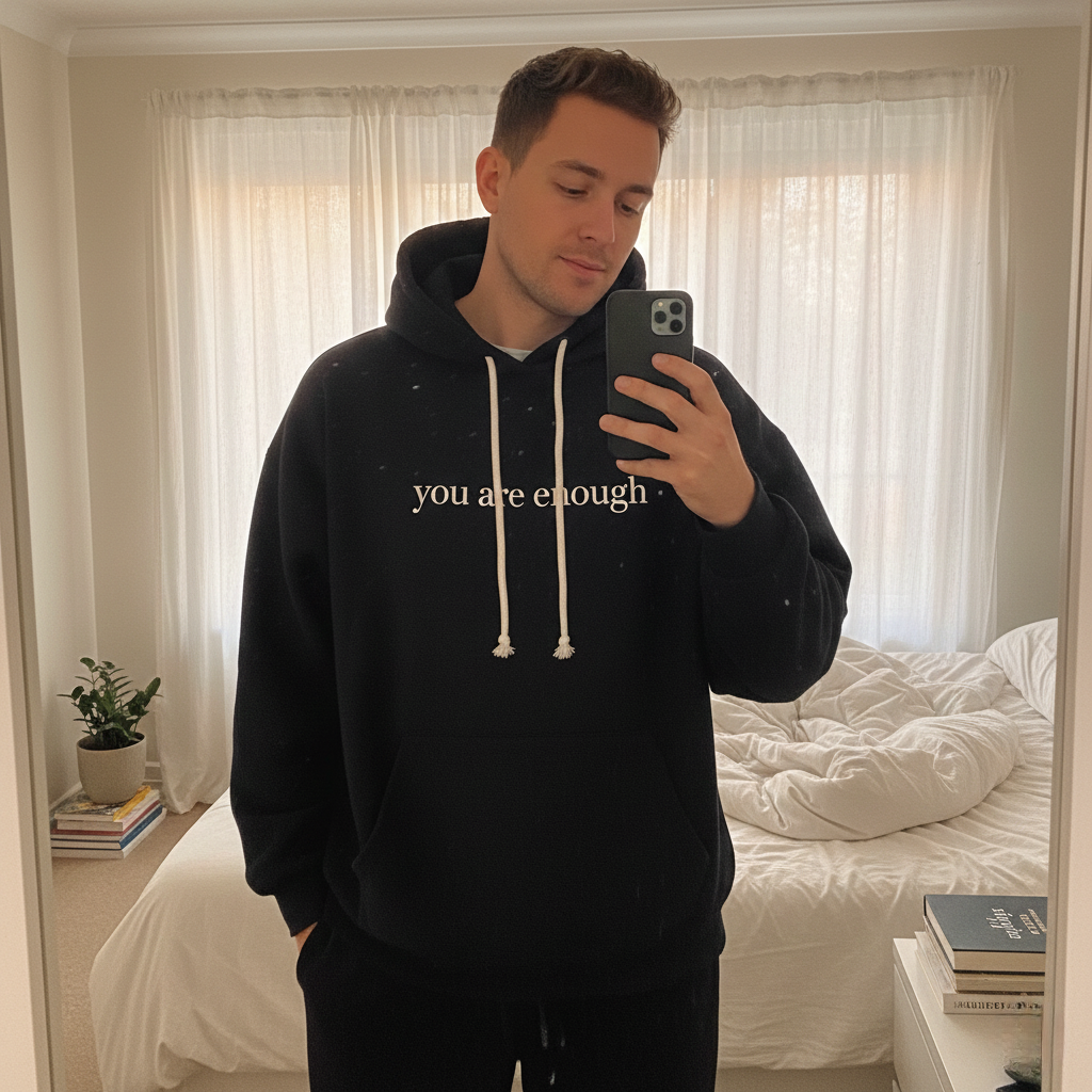 This hoodie won't fix that. But it puts something else in front of your eyes first. Two words on your chest. Before the voice gets a chance. Maybe it helps. Maybe it doesn't. But it's something.
