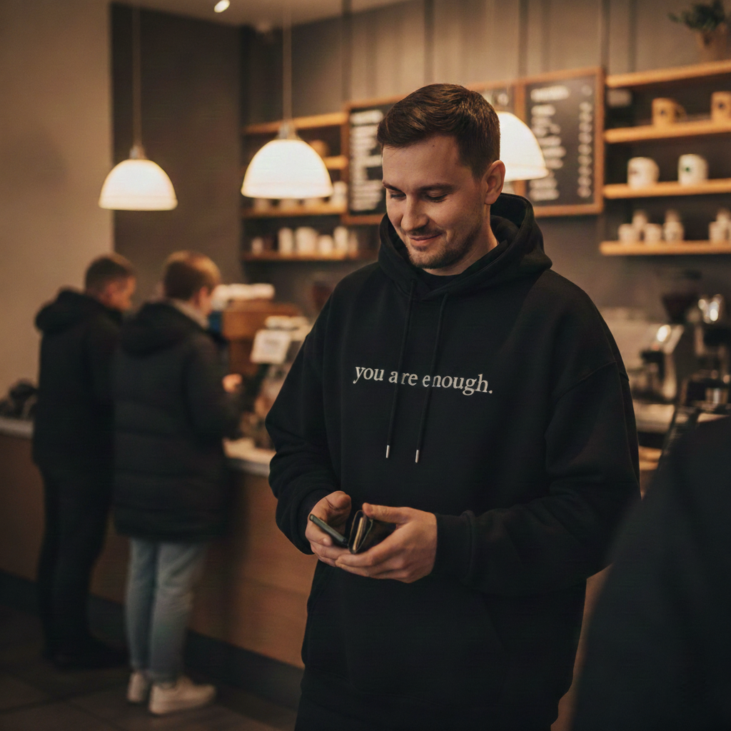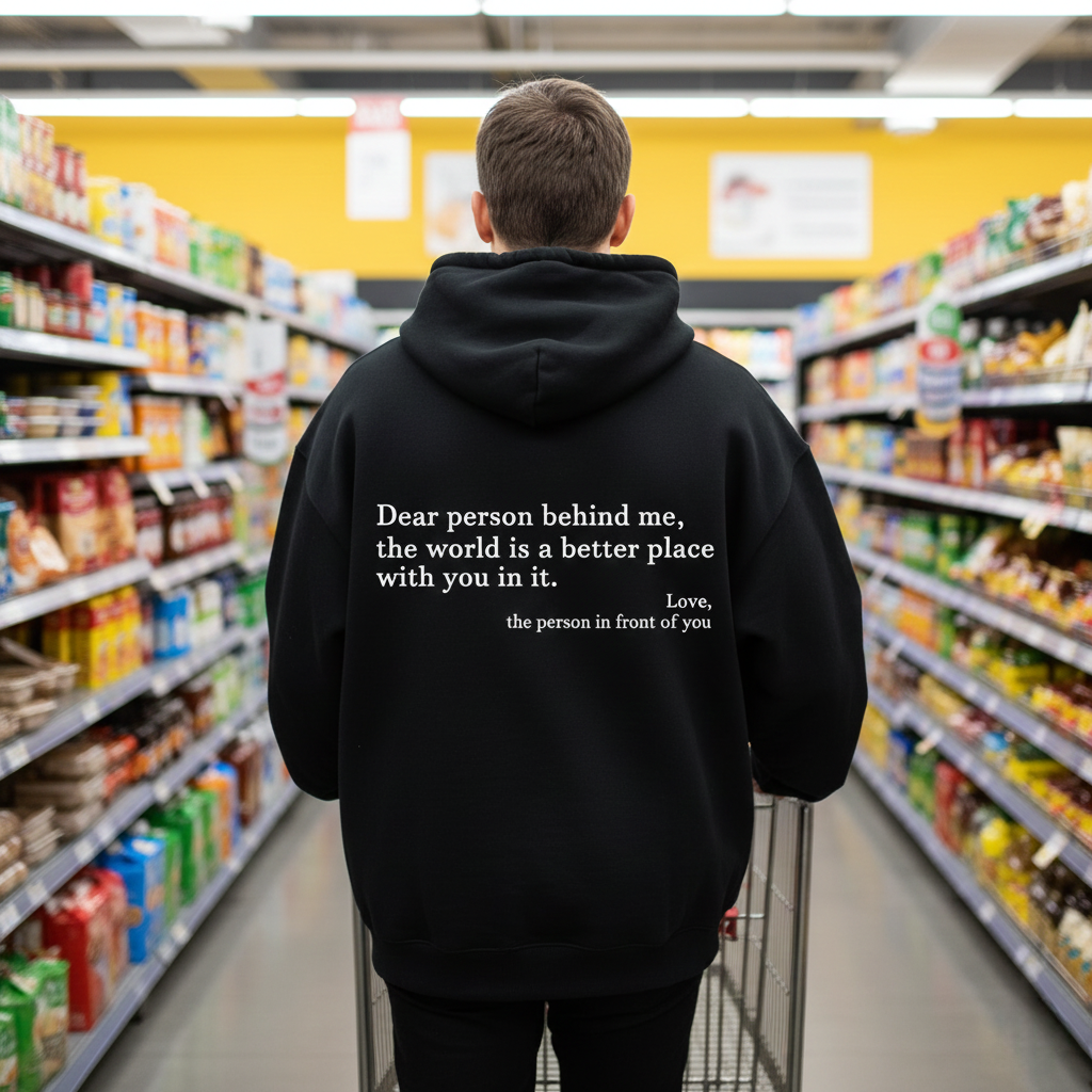 "I almost didn't go. Sat in my car for ten minutes. Then I looked down at my hoodie and thought fuck it. Went in. Stayed the whole time. A guy even asked me about the message on the back. First time in years I didn't count the minutes until I could leave."